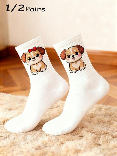 1/2 par de calcetines tipo tripulación con estampado de cachorrito, calcetines unisex de moda para parejas, adecuados para todas las estaciones - Multicolor - Añade 1