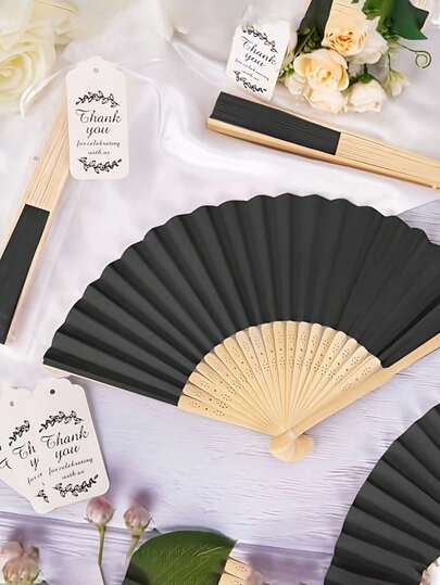 1/3/5 piezas Juego de abanicos de mano para bodas, abanicos de papel negro plegables de mano, abanicos plegables, abanicos de mano, abanicos plegables para bodas, abanicos de bambú DIY con etiquetas de agradecimiento y bolsas de organza, adecuados para invitados de bodas de verano y accesorios de baile