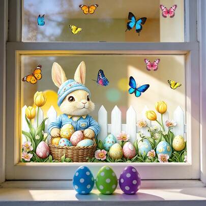 1/3 piezas Conejitos y mariposas de Pascua de primavera, pegatinas reutilizables de PVC con estática en ambos lados, adecuadas para escaparates de tiendas, cocinas, habitaciones infantiles, guarderías y decoraciones de fiestas festivas. - Pegatinas de Pascua para ventanas - Añade 14