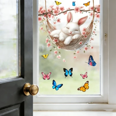 1/4 piezas Pegatinas de ventana con animales de primavera, conejo, oso, mariposa y flor durmiendo, pegatinas estáticas reutilizables y sin adhesivo para decoración de puertas y ventanas del hogar y la cocina. - Multicolor - Añade 9