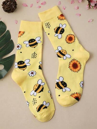 Calcetines de media caña para mujeres con estampado de flores y abejas - Multicolor - Añade 1