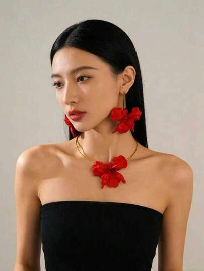 1 Set/1 Par/1 Pieza Conjunto de collar colgante y aretes con flores exageradas de estilo europeo y americano, joyería asimétrica de pétalos de moda para mujer