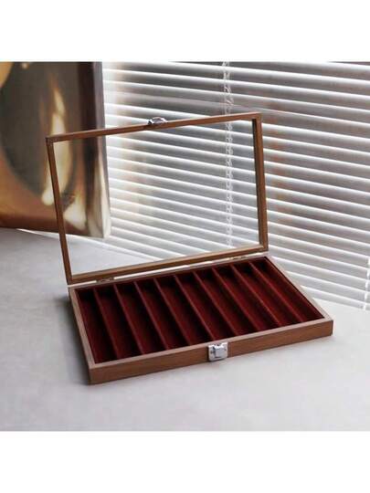 Organizador de joyas con 10 espacios, textura de nogal, con tapa y cubierta de vidrio para guardar collares, pulseras y colgantes - Caja collar color nogal - Añade 8