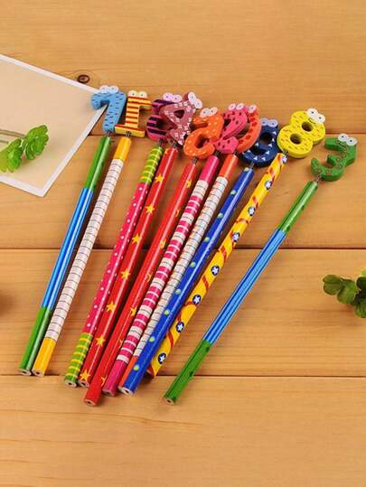 10 piezas de lápices de madera con números del 0 al 9 en diseño de dibujos animados, HB, artículos de papelería creativos para el aprendizaje de estudiantes - Multicolor - Añade 5
