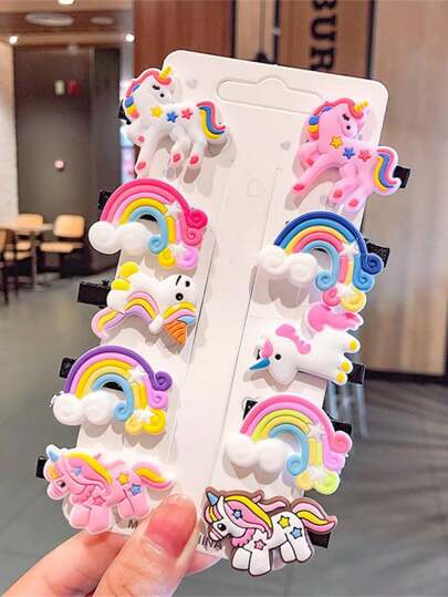 10 piezas de Pinzas de cabello para niñas con estampado de unicornio arcoíris y dibujos animados (se enviarán aleatoriamente 2 estilos de potro) - Multicolor - Añade 6