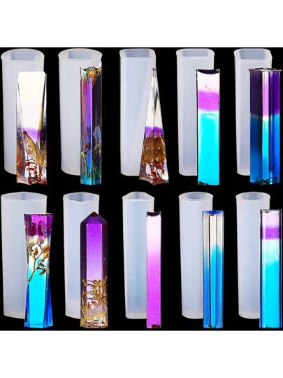 10 piezas/set Molde de silicona para colgante de resina de cristal DIY, molde de resina epoxi, incluidas formas de barra, cubo, cilindro, triángulo y cristales - Blanco - Añade 3