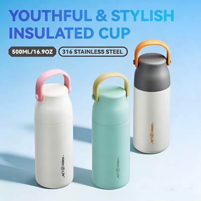 500ml Vaso aislado de acero inoxidable 316, con asa de goma y base antideslizante, taza para coche, infusor de té, botella de agua deportiva de gran capacidad