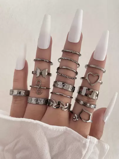 16 Piezas/set Conjunto De Anillos Con Diseño De Corazón, Mariposa, Infinito, Figura 8, Hoja De Árbol, Gato, Geométrico Y Rombo, Adecuado Para El Desgaste Diario De Hombres Y Mujeres - Negro de pistola - Añade 1