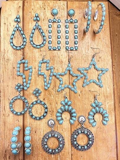 1 par de Pendientes largos de estilo boho occidental vintage con colgante geométrico de turquesa - Plata antigua - Añade 6