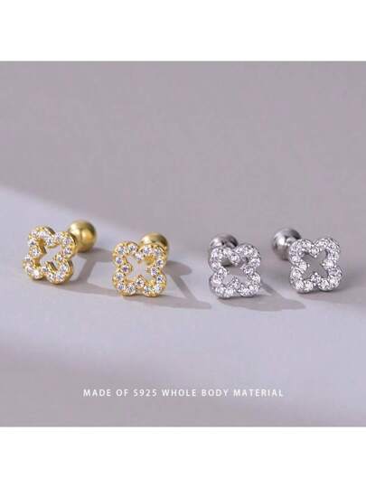 1 par de pendientes de trébol mini elegantes y de moda personalizados de plata S925, joyería nupcial de estilo sencillo - Pendientes de plata de primera ley con flor de cuatro hojas - Añade 1