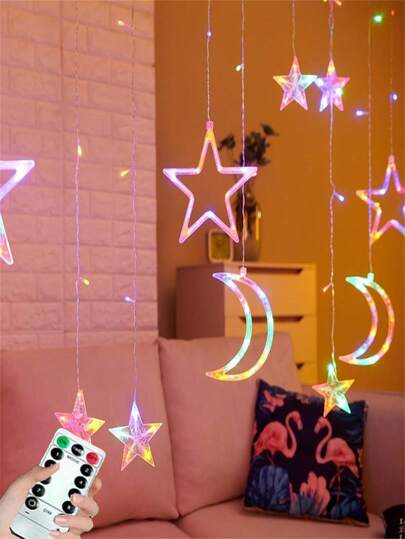 1 pieza Cortina de luces decorativa de 11,5 pies con luces LED de estrellas y lunas, luz nocturna con control remoto, alimentada por USB para decoración del hogar y ambiente de fiesta - Multicolor - Añade 12