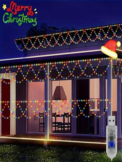 1 pieza Luz colgante para exteriores con 138 LED - Diseño de carámbano semicircular, alimentado por USB con 8 modos, perfecto para patio trasero, patio, jardín, fiestas, bodas - Multicolor - Añade 2