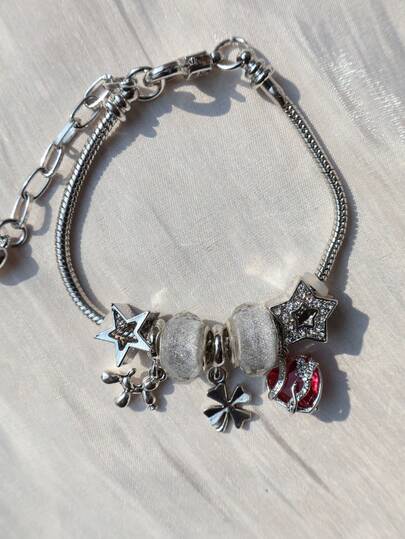 1 pieza Pulsera con dijes de perro globo, trébol, corazón y estrella, estilo de moda callejera - Plateado - Añade 5