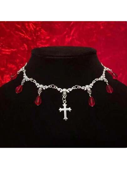 1 Pieza Collar Colgante Con Cruz Que Gotea Sangre, Estilo Gótico Romántico, Hermosas Joyas Para Fiestas - Rojo - Añade 3