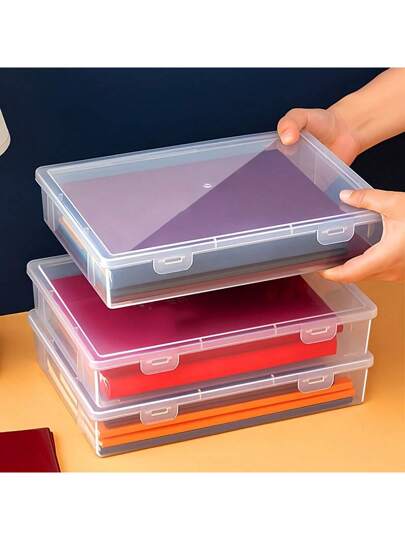 1 Pieza Caja de almacenamiento de plástico transparente tamaño A4 con tapa con bisagras, caja de almacenamiento de escritorio ahorradora de espacio para útiles de oficina y escolares - transparente - Añade 4