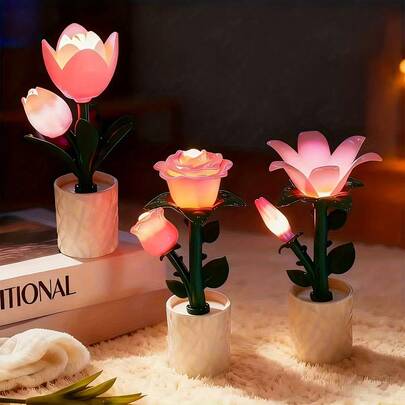 1 pieza Lámpara de ambiente creativa, luz nocturna decorativa, diseño floral rosa, múltiples estilos disponibles, funciona con batería de botón sin necesidad de cable, diseño de interruptor en la parte inferior, iluminación suave que alivia la fatiga ocular, adecuada para decoración de plantas en maceta, decoración de cumpleaños, lámpara de mesita de noche, decoración de escritorio, ambiente festivo, decoración del hogar, ideal como regalo para niños, regalo de vacaciones o regalo del Día de San Valentín