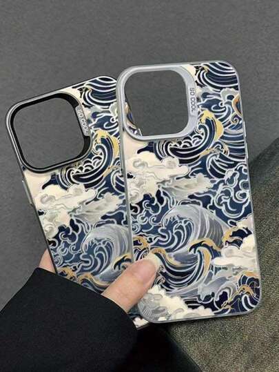 1 pieza Funda de teléfono a prueba de caídas con diseño de ola Ukiyo-E, compatible con Apple 16/15/14/13/12/11/X/XS/7/8 - Concha plateada coloreada - Ondas Ukiyoe blancas - Añade 1