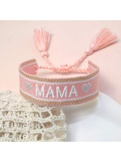 1 pieza Pulsera trenzada bohemia con bordado del corazón MAMA y flecos - Rosa Pálido - Añade 5