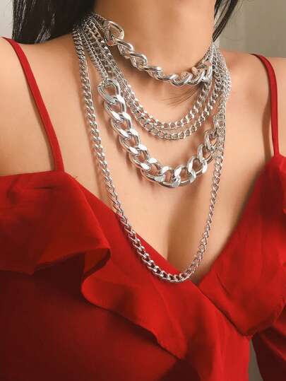 1 pieza Collar punk de múltiples capas exagerado para hip-hop, collar de cadena gruesa de moda para mujer - Plateado - Añade 1