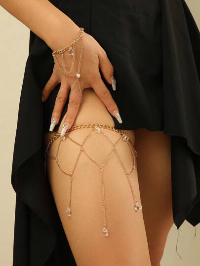1 Pieza Cadena De Metal De Varias Capas De Moda Con Colgante De Gota De Agua Clara Conectado A Pulsera De Dedos Y Cadena De Pierna - Dorado - Añade 2