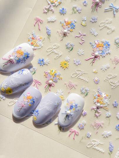 1 pieza Pegatinas de uñas con flores de cinta de perlas a la moda, pegatinas de flor de campo de cristal de diamante 5D, nuevos decorativos de uñas de primavera 2025 para manualidades DIY - Multicolor - Añade 4