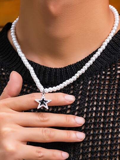 1 pieza Collar con colgante de estrella de cinco puntas con perlas falsas incrustadas, de moda y personalizado, adecuado para fiestas y uso diario para hombres - Blanco - Añade 1