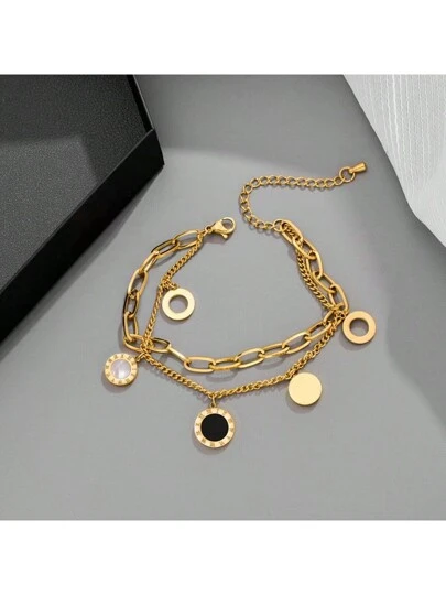 1 Pieza Brazalete De Doble Cadena De Moda Con Colgante De Círculo De Números Romanos - Dorado - Añade 4