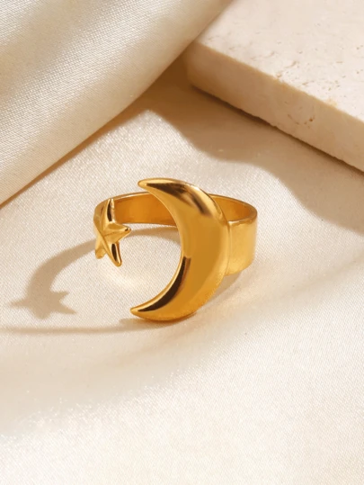 1 pieza Anillo abierto de acero inoxidable con diseño de estrella y luna, diseño minimalista asimétrico, adecuado para uso diario de mujeres - Estrellas y luna - Añade 5