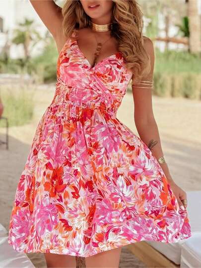 1 pieza Vestido de punto con estampado floral fruncido, ropa de resort para primavera y verano - Rosa - Añade 1