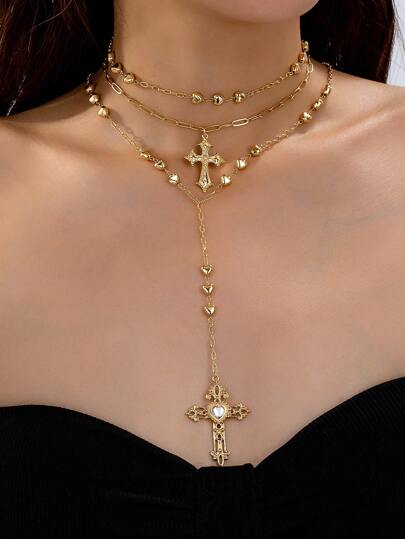 1 pieza Collar con colgante de cruz con cadena en forma de corazón dorado, conjunto de joyería de cruz en capas en forma de Y - Dorado - Añade 1