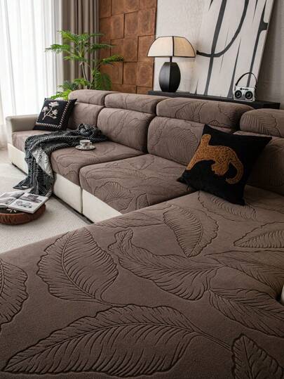 1 pieza Funda de sofá de felpa coral con estampado de hojas, elástica, con estilo, antideslizante para todas las estaciones, lavable a máquina, decoración del hogar apta para mascotas - Marrón - Añade 1