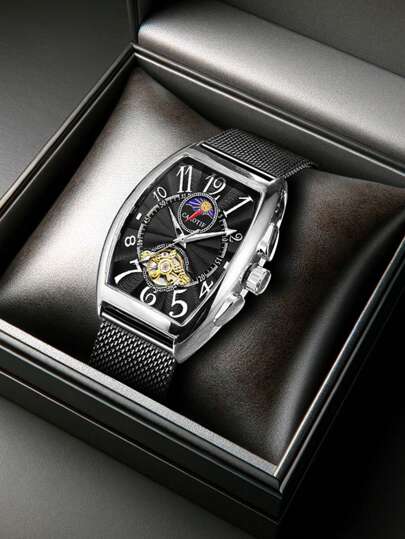 1 Reloj de pulsera automático mecánico con dial numérico, correa de malla negra y esfera luminosa, para uso casual masculino - Negro - Añade 1