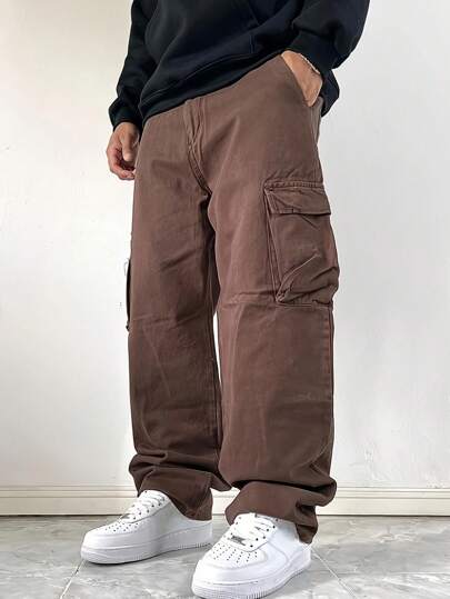 1 pieza Jeans rectos de mezclilla sin estiramiento de ajuste holgado de color marrón para hombre - Marrón - Añade 4