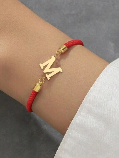 1 pieza Nuevo brazalete clásico con inicial A-Z para mujeres, brazalete ajustable de cuerda de color simple como regalo de joyería para mujeres - Rojo - Añade 4