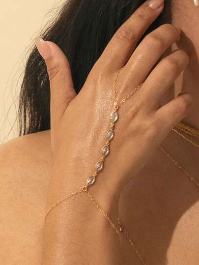 1 pieza Nuevo brazalete y anillo para el dedo de cadena de mano con cristales de estilo minimalista y elegante de moda para verano para mujeres - Dorado - Añade 5
