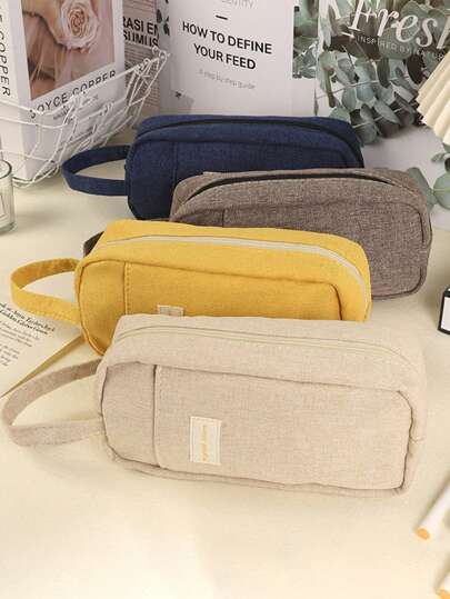 1 pieza Bolsa de lápices de unicolor retro, bolsa de almacenamiento de papelería insertable de diseño creativo, bolsa de accesorios de aprendizaje esencial para el inicio de la temporada escolar, bolsa de almacenamiento esencial para finalizar el escritorio - Multicolor - Añade 4