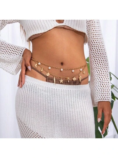 1 pieza Cadena para la cintura con colgante de estrella de mar y concha, cadena corporal sexy para decorar la cintura, estilo de vacaciones de verano - Multicolor - Añade 1