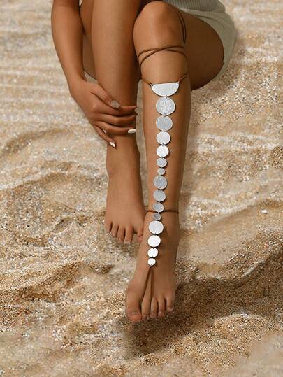 1 pieza Cadena para la pierna de estilo de playa, de metal plateado con diseño geométrico circular encadenado con terciopelo marrón ajustable - Plateado - Añade 1