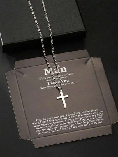 1 pieza Collar con colgante de cruz de acero inoxidable simple para hombres (60cm), viene con caja de regalo adecuada para novio/esposo, incluye tarjeta con cita de amor para expresar afecto - Plateado - Añade 1