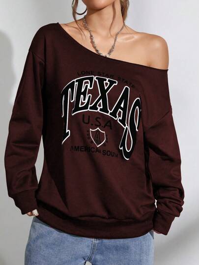 Flirla 1 pieza Sudadera casual con hombros descubiertos con letras en inglés de estilo elegante - Marrón - Añade 1
