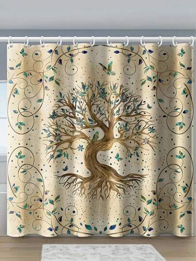 1 Pieza Cortina De Ducha Impermeable Y Resistente Al Moho Con Patrón De Árbol Y Planta Verde Con Ganchos, Decoración Del Dormitorio - Beis - Añade 1