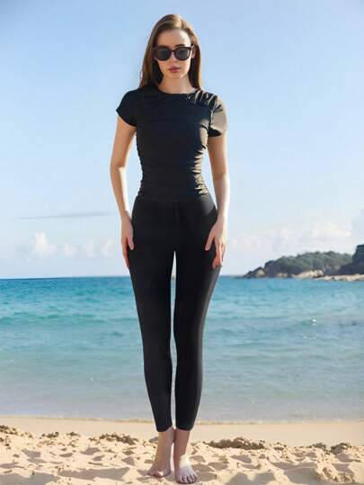 1 pieza Traje de baño de una sola pieza unicolor con drapeado para mujer, adecuado para la playa y vacaciones de verano - Negro - Añade 1