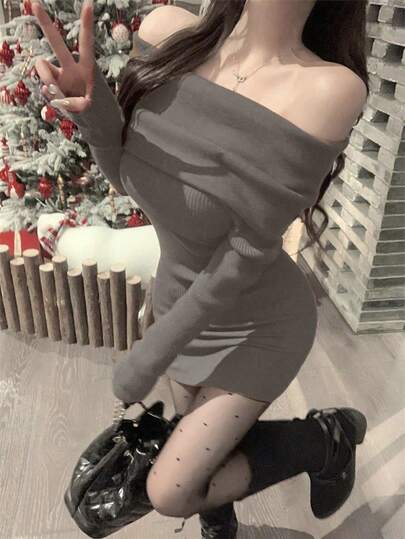 1 pieza Vestido de punto de unicolor con hombros descubiertos y cintura ceñida, diseño sexy, adecuado para uso diario en invierno - Gris elegante - Añade 5