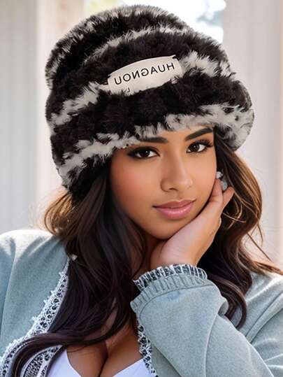 1 Pieza Sombrero Tejido Con Piel De Conejo Rayado Sobredimensionado Para Mujer, Gorro De Invierno Cálido Para Uso Diario - Negro - Añade 3