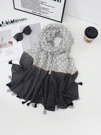 1 pieza Bufanda con estampado y flecos para mujer, chal de playa para vacaciones - cuadros negros - Añade 4