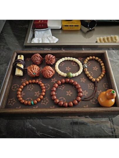 1 pieza Bandeja de madera, estilo vintage retro, bandeja rectangular, exhibidor de joyas de escritorio, caja de almacenamiento de entrada para llaves, bandeja de té de lujo de cuero, para el hogar - Multicolor - Añade 1