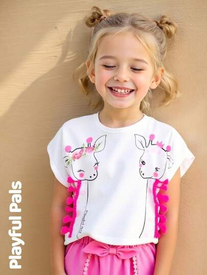 SHEIN 1 pieza Camiseta con mangas de murciélago, con bloques de color, diseño de ciervo y logo, estilo lindo para niñas jóvenes y versátil - Rosa Fucsia - Añade 2