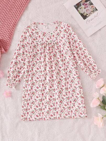 1 pieza Camisón largo con volantes y estampado floral para niñas, vestido de casa simple y elegante para otoño e invierno - Multicolor - Añade 1