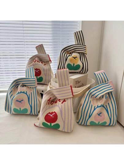 1 pieza/Bolso de mano casual de punto estilo flor para llevar el almuerzo - Multicolor - Añade 6