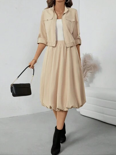 Chiquease Conjunto de 2 piezas: nueva chaqueta de abrigo para mujer con mangas abullonadas y bajo utilitario - Caqui - Añade 1
